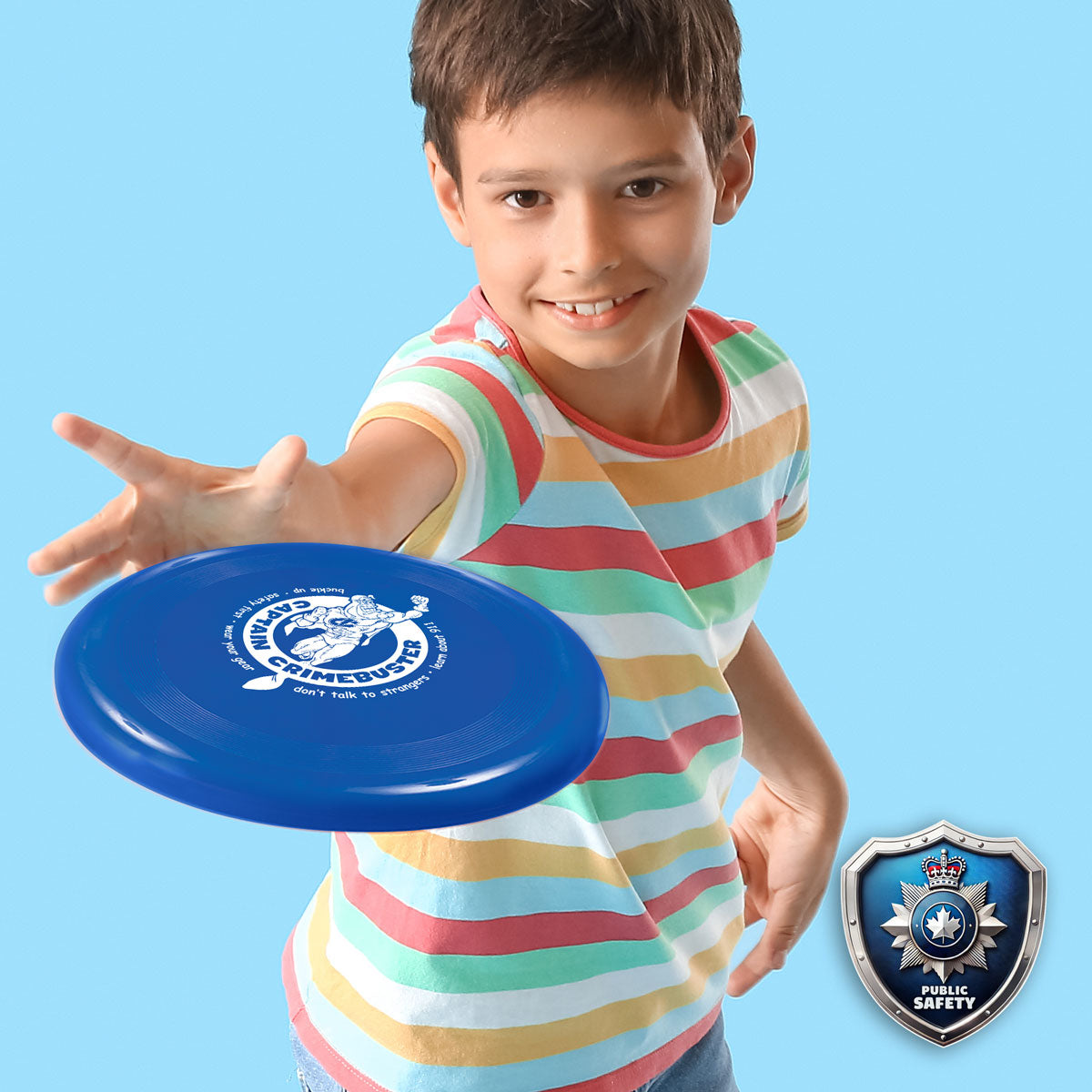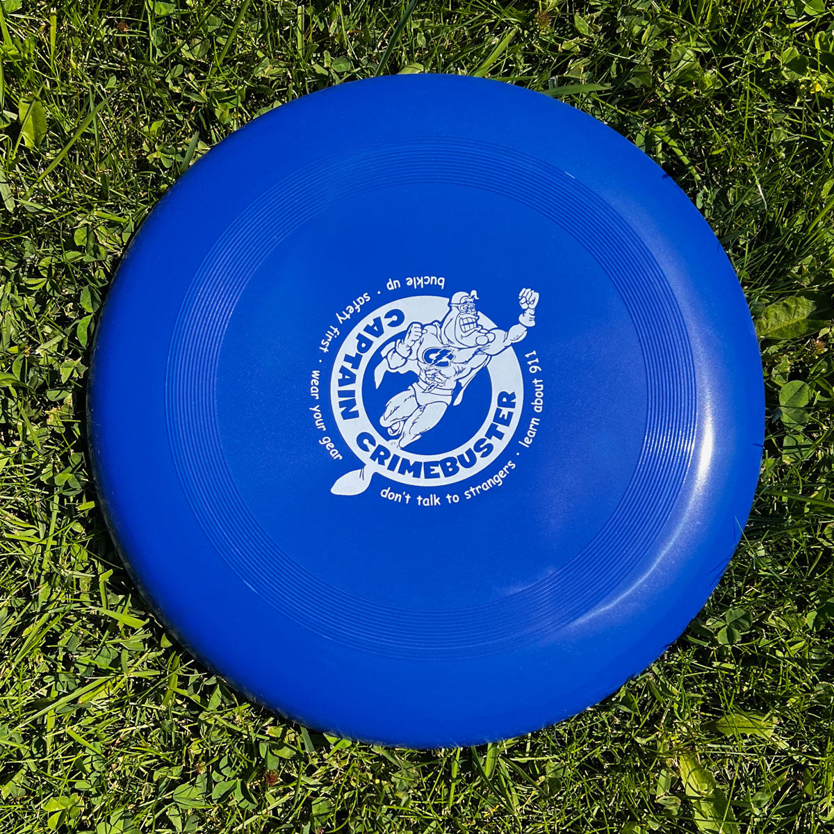 Get ready for high-flying fun and important safety lessons with the Captain Crimebuster Flying Saucer! Designed with kids in mind, this bright blue frisbee features our fearless hero front and center, surrounded by key safety messages like “Don’t talk to strangers,” “Wear your gear,” and “Learn about 911.”